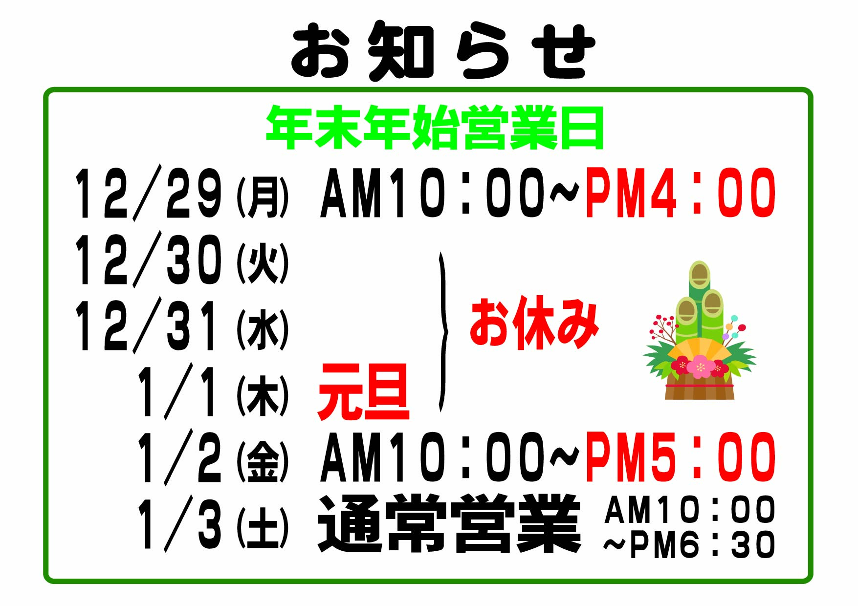 おしらせ 小売部 2025.12.26 更新 年末年始営業時間のおしらせ 平素は当店をご利用いただき、ありがとうございます。 年末年始営業時間のおしらせです。 初売りは1/2(金)10:00開店です。 スタッフ一同お待ちしております。 PREV