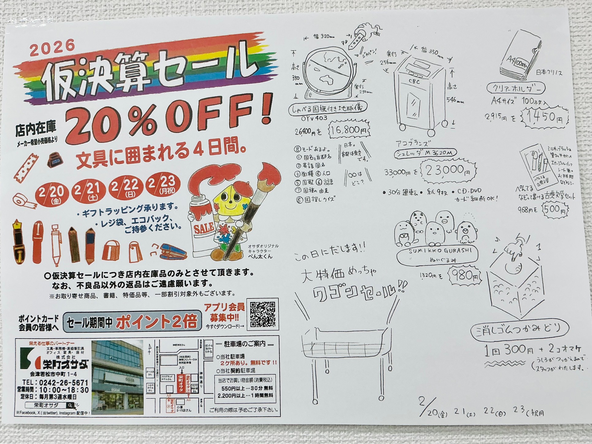 おしらせ 小売部 2026.02.12 更新 仮決算セール開催決定!2月20(金)21(土)22(日)23(月/祝) クリアホルダー100枚入1,450円等! 仮決算セールを開催!! この日に出します!めっちゃワゴンセールで大特価提供! シュレッダー 33,000円を23,000円 しゃべる地球儀26,400円を16,800円 クリアホルダー 2,915円を 1,450円 PREV